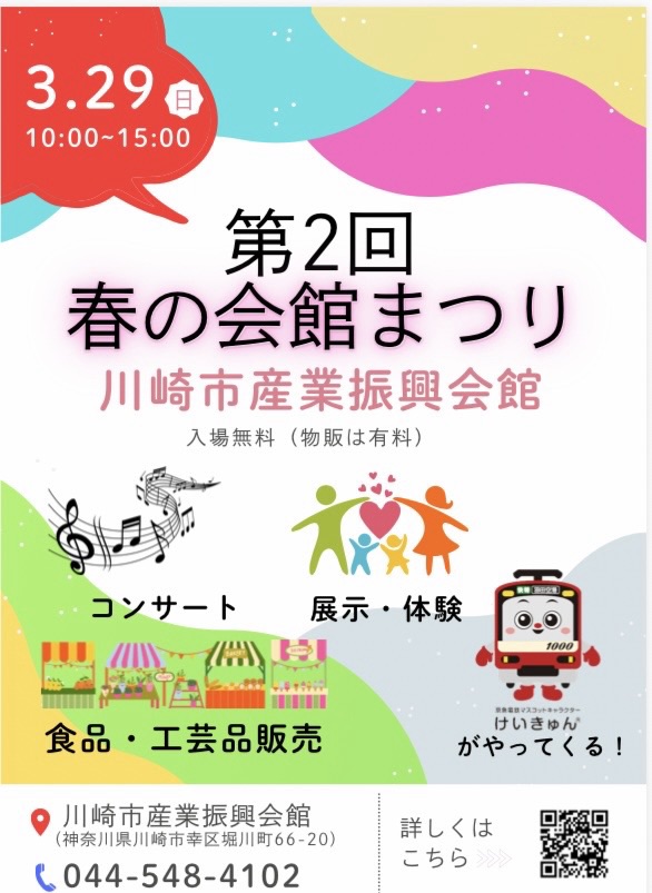 2026年3月29日(日) 川崎市産業振興会館の春祭りで、ミニコンサートを行います。午前10時30分から4階展示室にて。